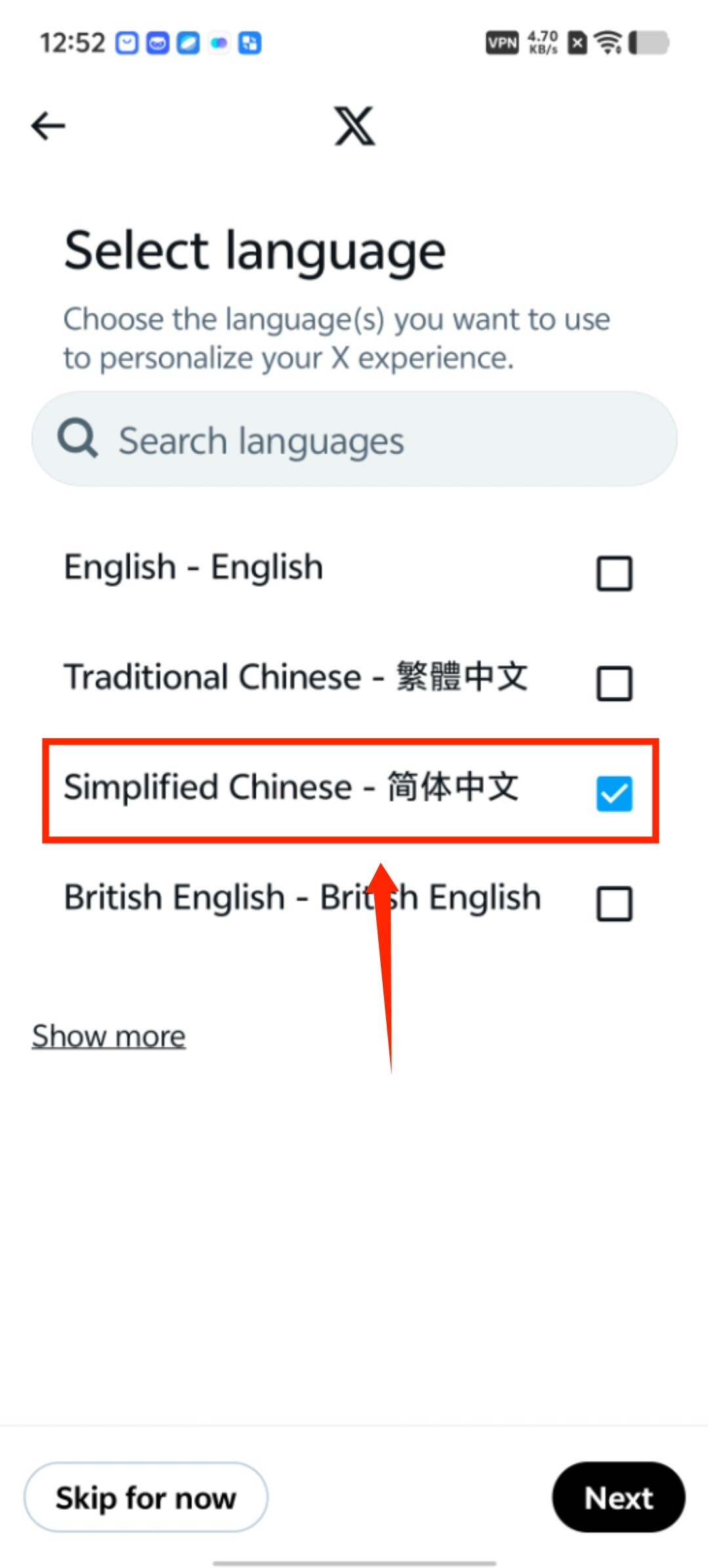 5、最后进入语言设置页面,勾选“Simplified Chinese-简体中文”选项,然后点击右下角的“next”按钮就可以了。