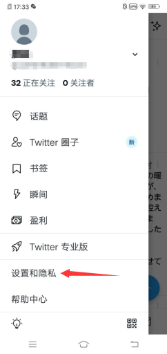 2、在个人设置页面点击"设置和隐私"。