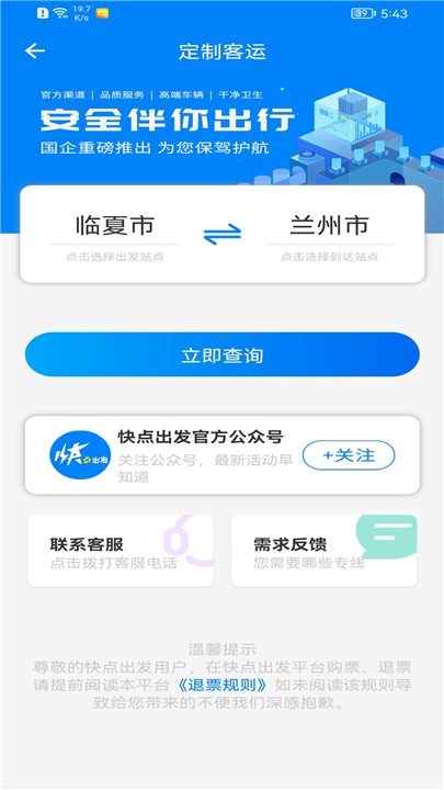 “快点出发”是临夏道合科技开发的智能出行APP,覆盖临夏及周边地区,提供打车、租车、公交查询、定制客运等服务。用户可实时追踪司机位置、预约叫车、选择多样车型,并享受安全审核与实惠价格,满足本地多样化出行需求。