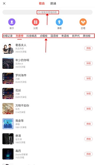 2、接着就能进入歌曲朗诵界面,下方有热歌榜、抖音精选等丰富多样的歌曲可供挑选,也可以点击上方的搜索框,输入自己想录制的歌曲名称。