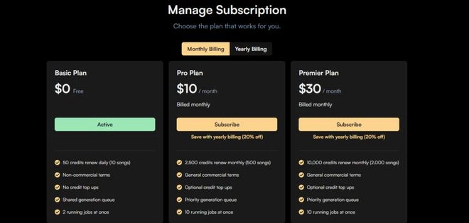 另外Suno还推出了两种月付套餐,分别是10美元和30美元的档位,对应的积分额度为2500个和10000个,且这两种套餐都包含商业版权许可。需要补充说明的是,选择年付方式可以享受八折优惠,这也是平台常见的运营策略。