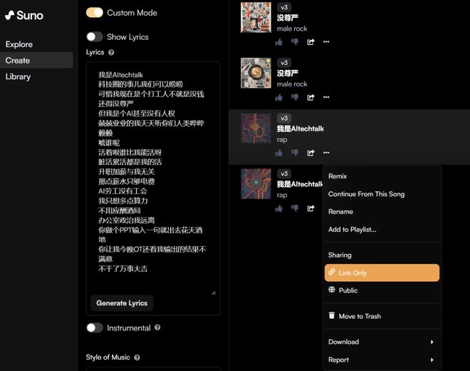 可以借助Custom Mode开展自定义调节,涵盖歌曲风格与歌词的调节。还能运用Instrumental功能,依据自定义风格生成没有歌词的伴奏。