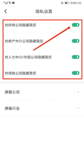 3、进入设置界面,滑动右侧圆点即可隐藏简历。