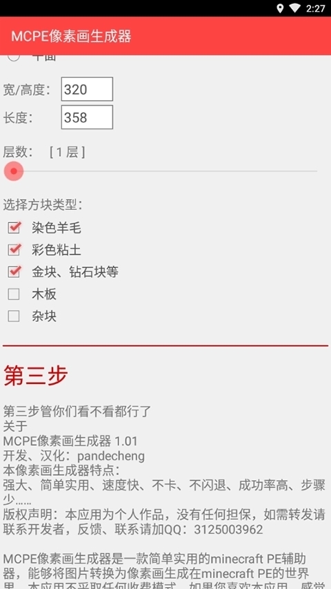 MCPE像素画生成器以图像转换为核心功能,通过智能算法将照片、动漫角色、游戏截图等转化为《我的世界》风格的像素画。用户可自由选择羊毛、混凝土、玻璃等方块材质,调整画面精度与色彩还原度,生成的作品可直接导入游戏存档,覆盖至超平坦地图顶部位置,实现无缝衔接。