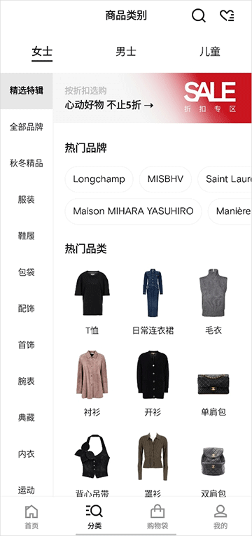 3、也可以在“分类”界面中按照女士、男士、儿童类别进行选购