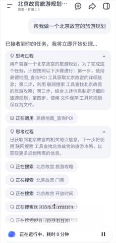举个例子,我在对话框里输入“帮我制定一份北京故宫的旅游规划”,接着选择探索模式,再添加高德地图MCP,把任务全权交给扣子处理。短短几分钟后,扣子就生成了一份详尽的旅游攻略,确实特别便捷!