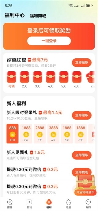 1、打开就能看到推荐的短剧,看短剧还可以领红包;