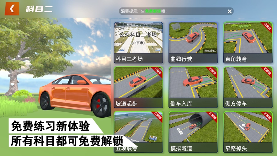 4、模拟真实考场(涵盖部分城市科目二真实考场),还原考试场景及扣分标准。