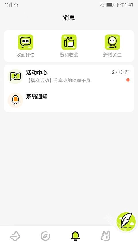 3、进入消息界面,可查看评论、赞、收藏和新增关注的消息提示,
