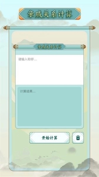 操作逻辑:界面模拟传统计算器,用户通过点击关系按钮(如“父亲”“母亲”)或输入文本,逐步构建关系链,点击“计算”即可得出结果。
