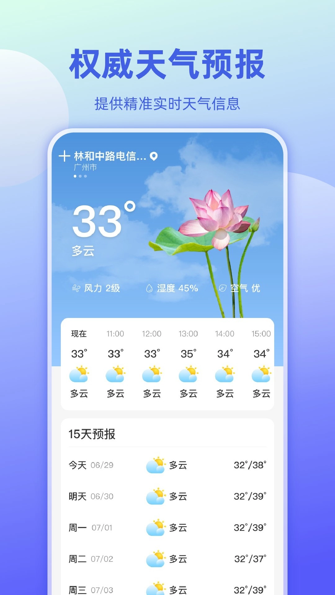 2、数据准确又全面,能实时查看精准的天气、温度,以及风速和空气质量信息。