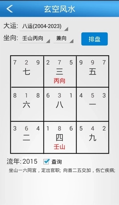 玄空部分:运盘、山盘、向盘(天地人三盘)的九宫格排布;下卦与替卦区分;流年流月飞星叠加。