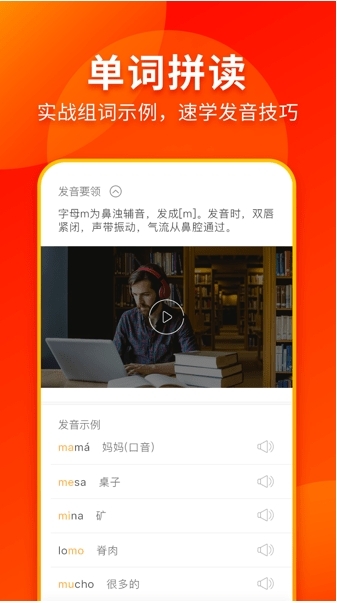- 单词拼读:西班牙语单词发音范例,用于练习西语字母及西语单词的听力。