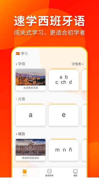 - 闯关式学习:趣味化的学习模式,对西班牙语基础内容进行细致讲解。