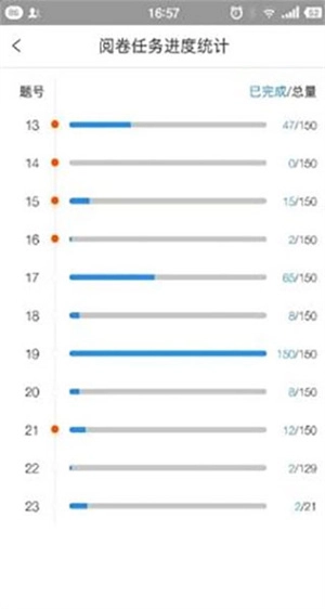 2、若需查看阅卷进度,点击总体进度右侧的图标即可查看详细进度数据,其中橙色圆点代表当前用户参与阅卷的试题。