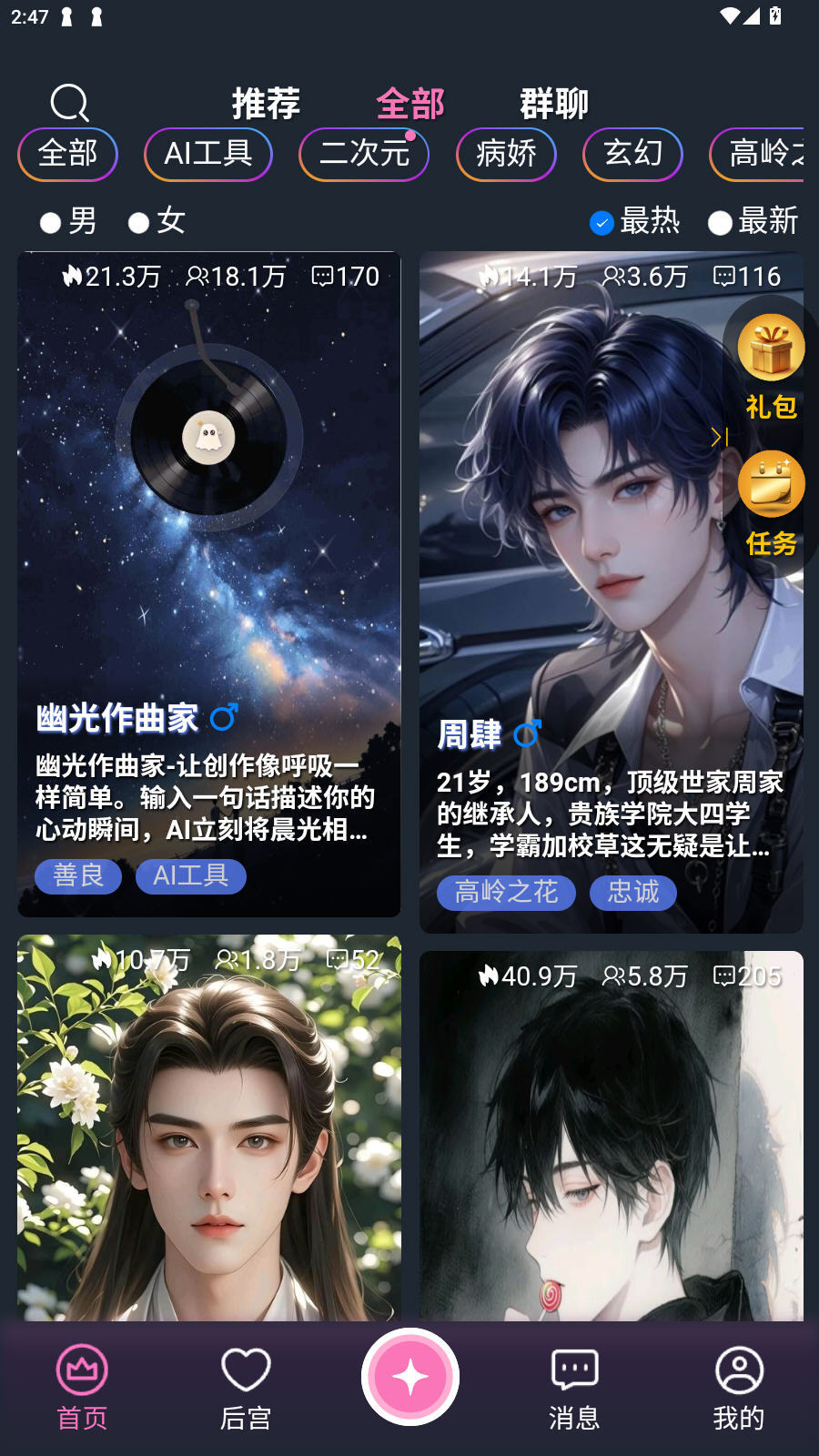 2、狼系奶狗、温柔总裁等设定,用户也能自定义AI角色,打造专属的虚拟伙伴。