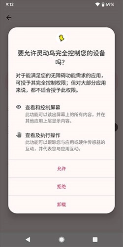 2、为防止弹窗信息被状态栏挡住,可点击下方的“无障碍未开启”按钮,进入无障碍设置页面,然后授予灵动鸟无障碍权限。