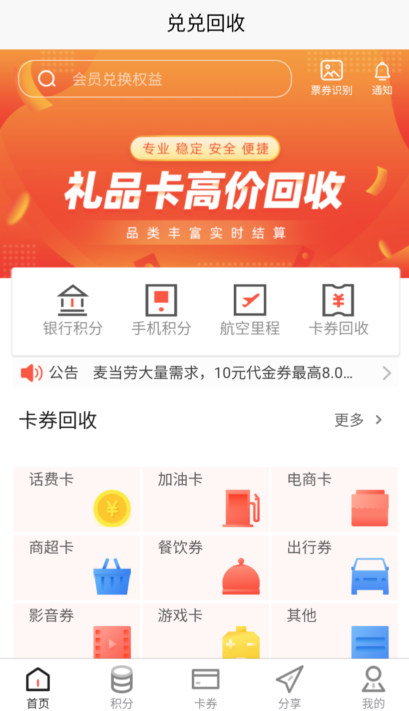 兑兑回收是一款专注于闲置卡券与积分回收的应用软件,用户可以高效地将闲置的礼品卡、购物卡等资源变现或兑换。该应用支持多种类型的卡券和积分,涵盖手机积分、航空里程、加油卡、话费卡、商超卡等多个领域。用户足不出户就能轻松完成回收交易,既实现了资源的再利用,也达到了环保节能的目的。
