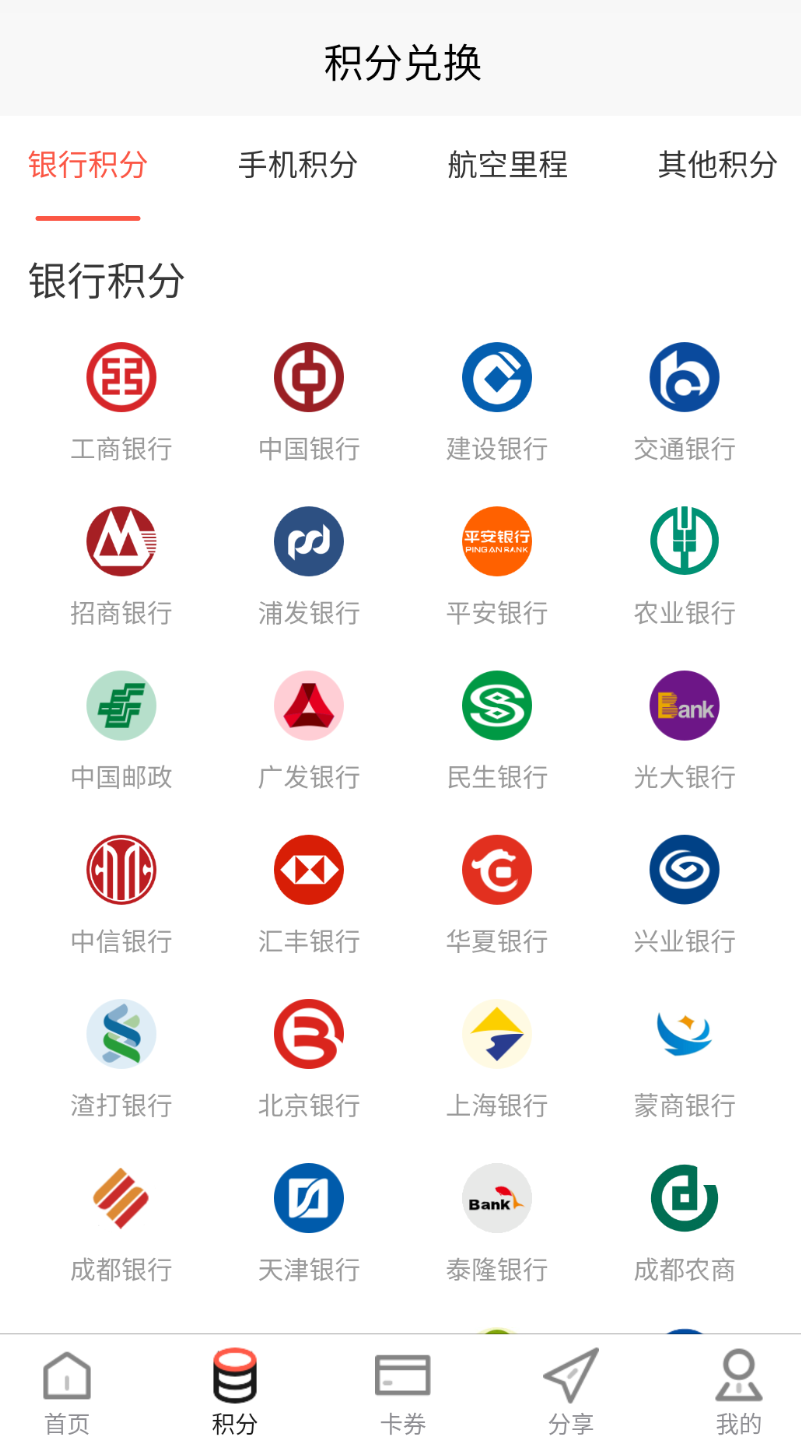 2、选择兑换类型:用户可在首页依据自身需求挑选对应的兑换类型,像银行积分、手机积分之类的都包含在内。