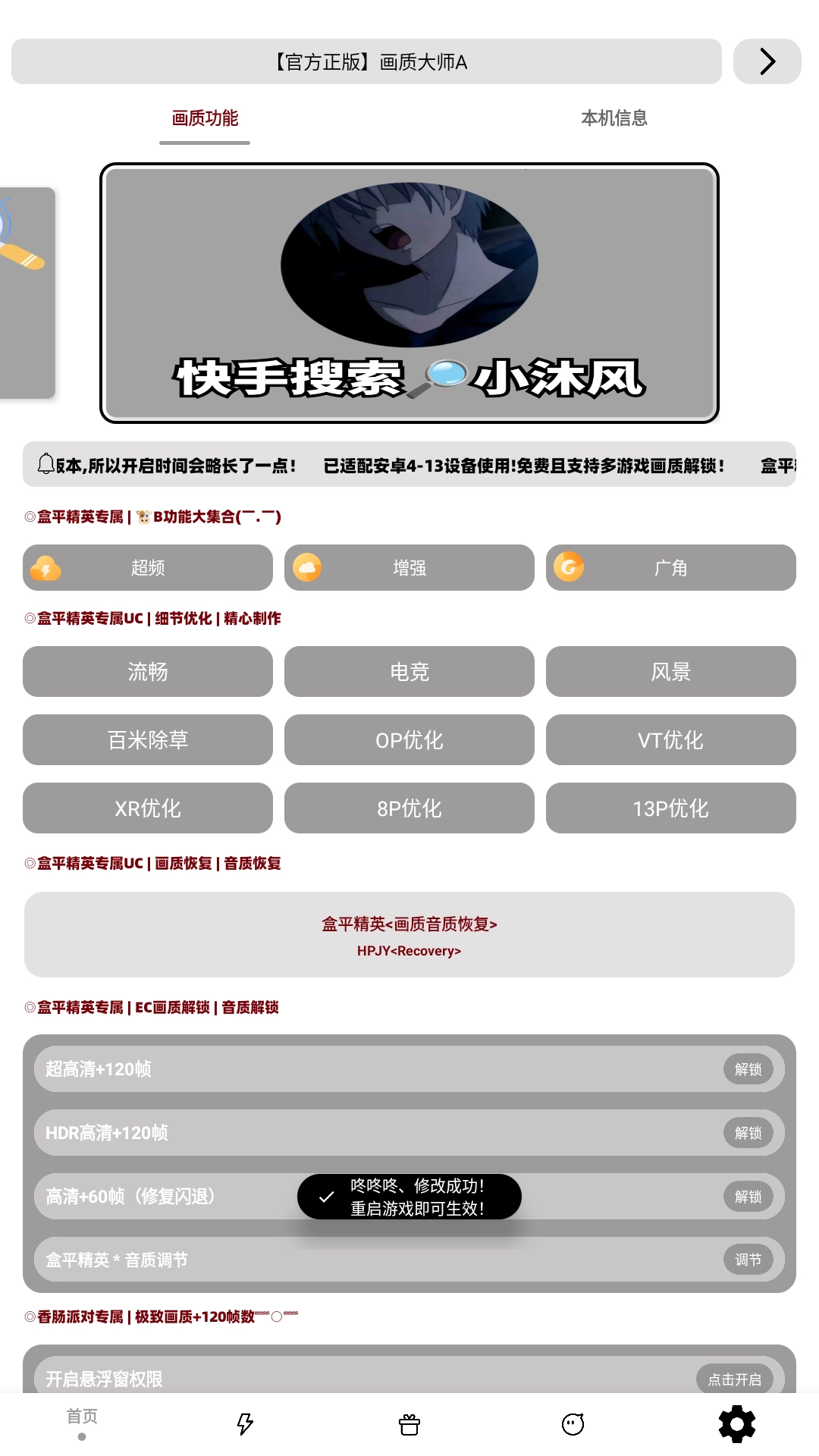 画质大师A手机版是一款用于提升游戏画质与流畅度的优化工具,也可称为“画质大师A小沐风”。它兼容多款游戏,像和平精英、香肠派对、黎明觉醒等都在支持范围内。该工具不仅能解锁游戏的最高帧数,还能最大限度地提升画质,对吃鸡类游戏的助力尤为显著。此外,画质大师A还配备了多种游戏辅助功能,例如和平精英的除草功能与广角功能,帮助用户轻松发现隐藏在草丛中的敌人。