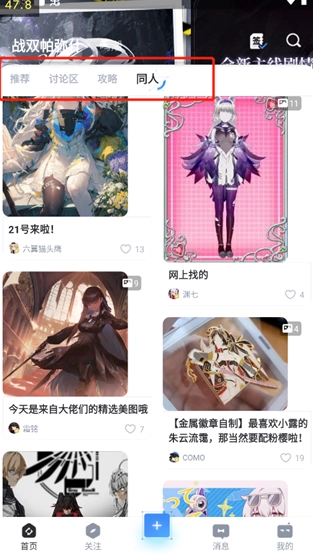 2、用户可以在这里查看最新的动态和资讯,分为推荐、讨论区、攻略和同人板块。