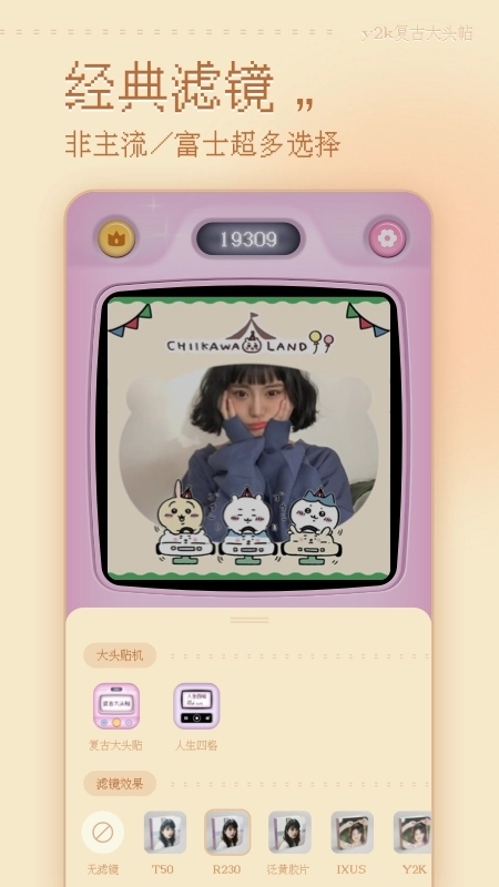 1、经典滤镜:多款千禧年风格滤镜,涵盖柔光、胶片、粉蓝、复古黄等类型,精准复刻老式相机的成像质感。