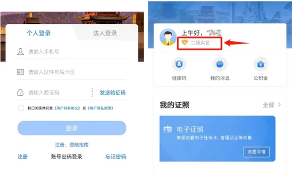 1、进入“我的”页面,点击登录入口进入登录界面,依次填写账号、身份证后六位及验证码完成登录;登录成功后,找到头像右侧的“二级实名”按钮并点击。