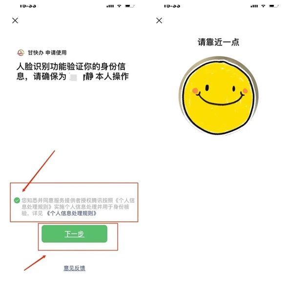2、完成人脸认证操作:勾选“已知悉并同意《个人信息处理规则》”,点击【下一步】,按照提示做出相应动作,完成人脸识别流程。