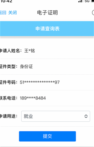 5、完成实人认证后,进入申请查询表页面,系统会自动带入申请人的基本信息。选定“申请用途”后,点击“提交”按钮即可。