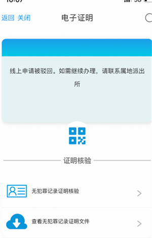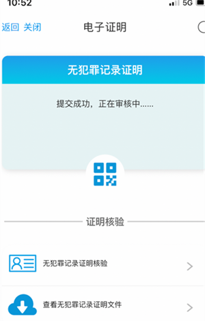 6、提交操作完成后,回到电子证明页面。对于处于审核状态的电子证明,点击“二维码”按钮会弹出提示“正在审核中,暂时无法查看”。