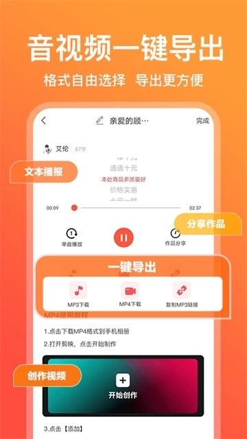 操作流程:用户输入文本后,可选择AI主播、调节语速/停顿/背景音乐等参数,快速生成定制化语音内容。支持MP3/MP4格式导出,适配剪映、快影等视频编辑工具。