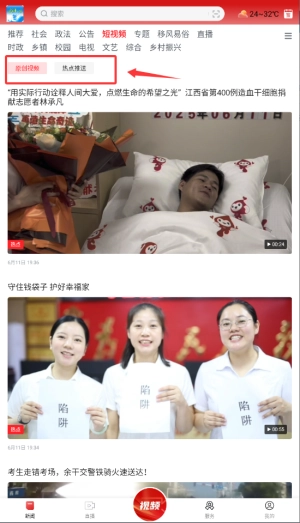 1、进入余干之窗后,在首页导航栏选择"短视频"频道,这里汇聚各类本土资讯视频内容。