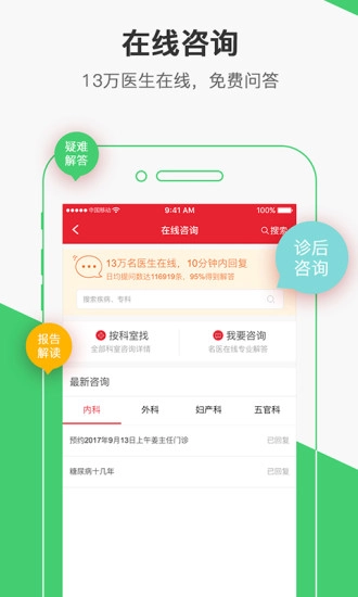 3、在线咨询与电话咨询:整合13万余名医生的在线咨询及电话咨询服务资源,24小时内专家回复率超90%。