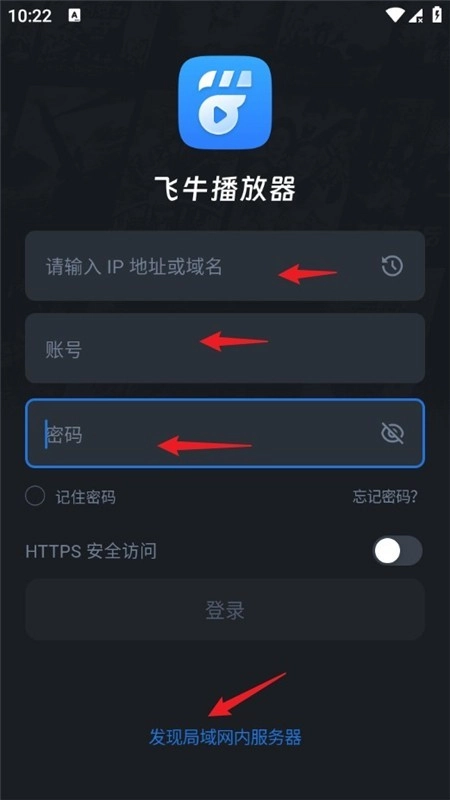 2、打开飞牛播放器,输入对应的IP地址或域名,再填入个人的账号与密码,最后点击登录按钮就可以了。