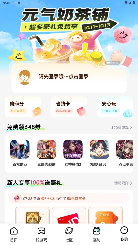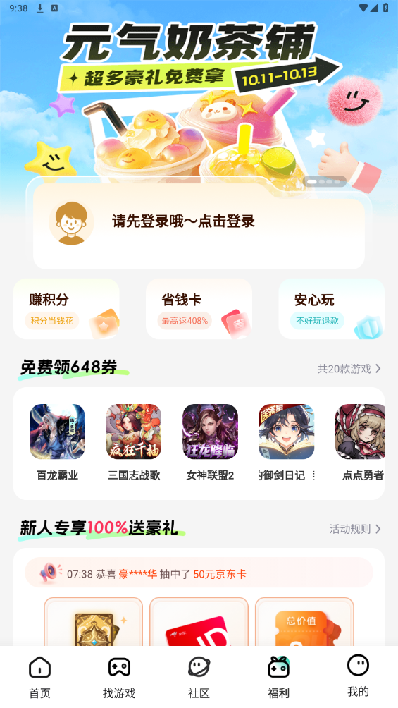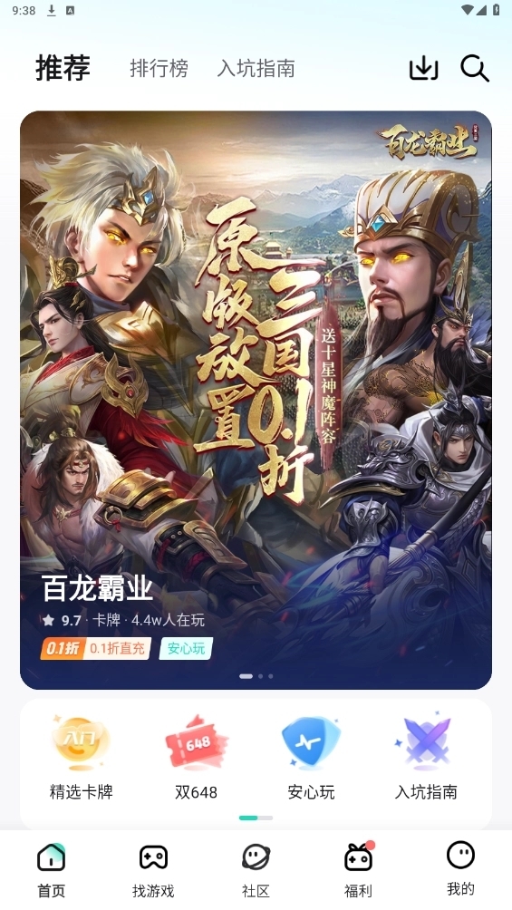 操作流程:下载安装后注册登录,首页浏览热门游戏或通过搜索查找目标游戏,进入详情页领取福利后下载。