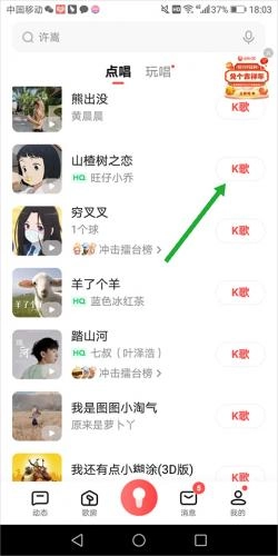 1、用户进入点歌页面后,挑选自己想参与合唱的歌曲,接着点击歌曲旁的【K歌】按钮。