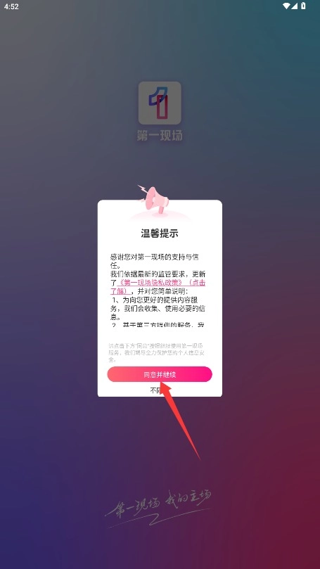 1、初次使用需阅读平台服务条款与隐私政策,确认后勾选同意并继续按钮进入应用。