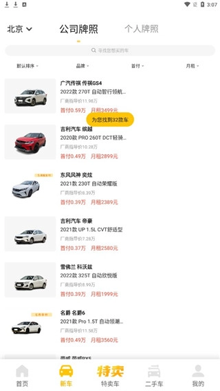 3、点击新车,这里可以看到月租和首付多少钱;
