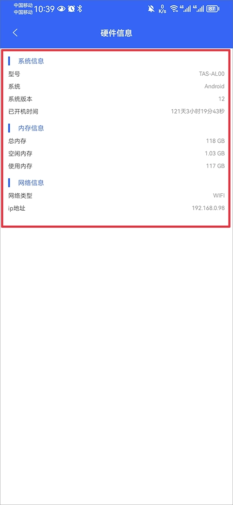 2、进入后即可查看手机设备的系统信息、内存信息、网络信息的详细数据