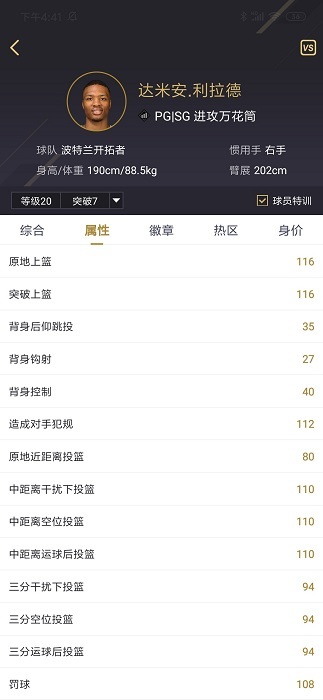 点击任意球员,可查看其详细属性(中投、三分、扣篮等)、徽章、热区、身价走势图等信息。这对于在游戏交易市场中买卖球员非常有帮助。
