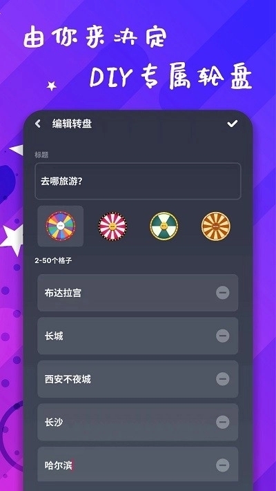 华丽的转盘界面,用户可自定义转盘上的选项。点击“旋转”后,指针随机停留在一个选项上。转盘动画流畅,视觉效果出色。