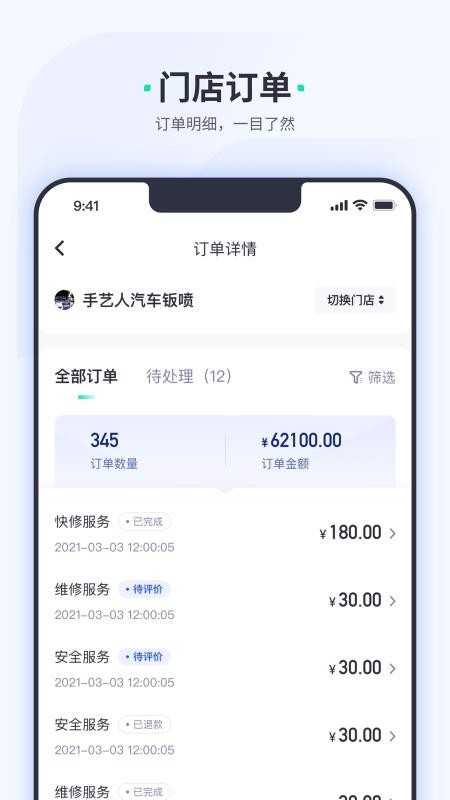 1)高效处理订单:提供快速、简便的订单处理功能,帮助车服务门店高效处理大量订单,提高订单处理效率。