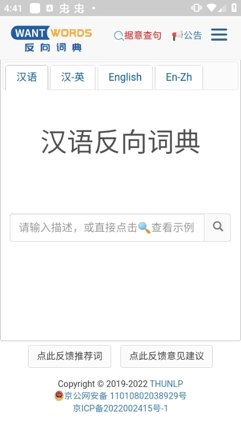 网页端直接访问 浏览器输入官方域名(反向词典.中国 或 reverse-dictionary.com),无需下载安装,全功能即时使用。支持PWA技术,浏览器菜单"添加到主屏幕"后,手机端体验接近原生APP,离线缓存最近查询记录。2026新版"深色模式"自动跟随系统,护眼且省电。