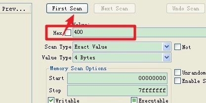 4、在“Hex”的输入框中输入400,然后点击“first scan”。