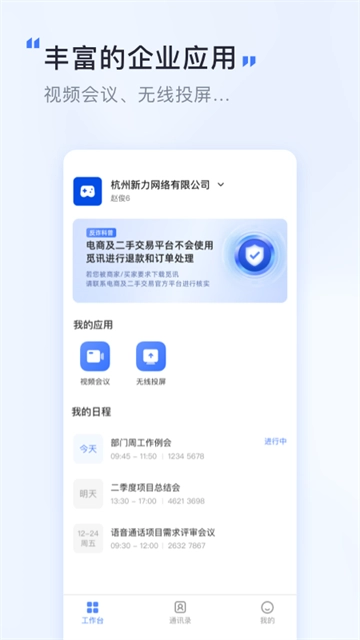 1、为企业用户配备多元化的企业级应用功能,像视频会议、无线投屏、企业通讯录等,助力企业达成对内管理与对外沟通的双重需求