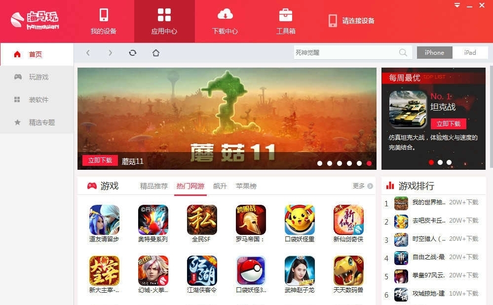 安装与启动:从官网下载对应系统版本(Windows/Mac),双击安装后打开,红色主题界面清晰分区:左侧功能栏(应用、文件、工具等),右侧内容区。