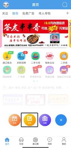 登录通辽团App → 底部导航栏点击【发布】中央大按钮(橙色“+”图标)→ 在弹出菜单中选择【招聘求职】→ 点击【招聘信息】。