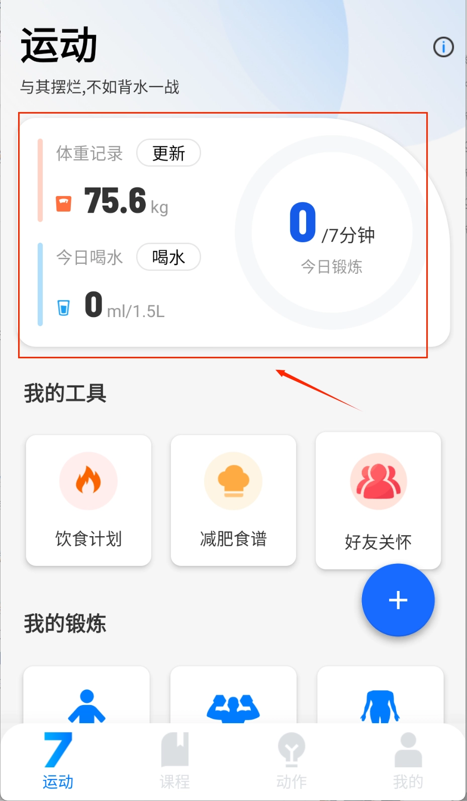 1、打开后,先进行体能测试。系统会依据测试结果推荐适配的训练强度。新手可以从新手课程起步,慢慢适应。