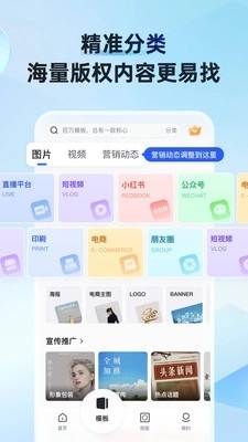 模板中心:按场景、行业、尺寸、节日等分类的海量模板库,支持关键词搜索,一键使用。