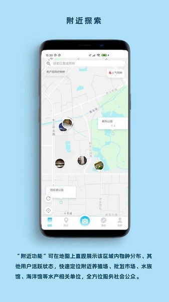 可在地图上直观呈现该区域内的物种分布情况以及其他用户的活跃状态,还能快速查找附近的养殖场、批发市场、水族馆、海洋馆等各类水产相关单位,从而为用户提供全面的服务支持。